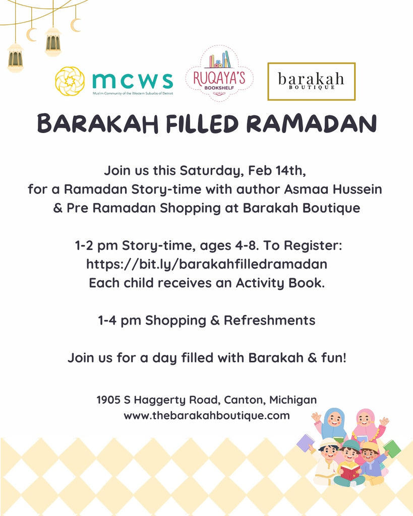 She will be reading her favorite books from Ruqaya's Bookshelf from 1-2 pm. We carry a ton of their books at Barakah Boutique. Ages 4-8pm. Limited Spots.